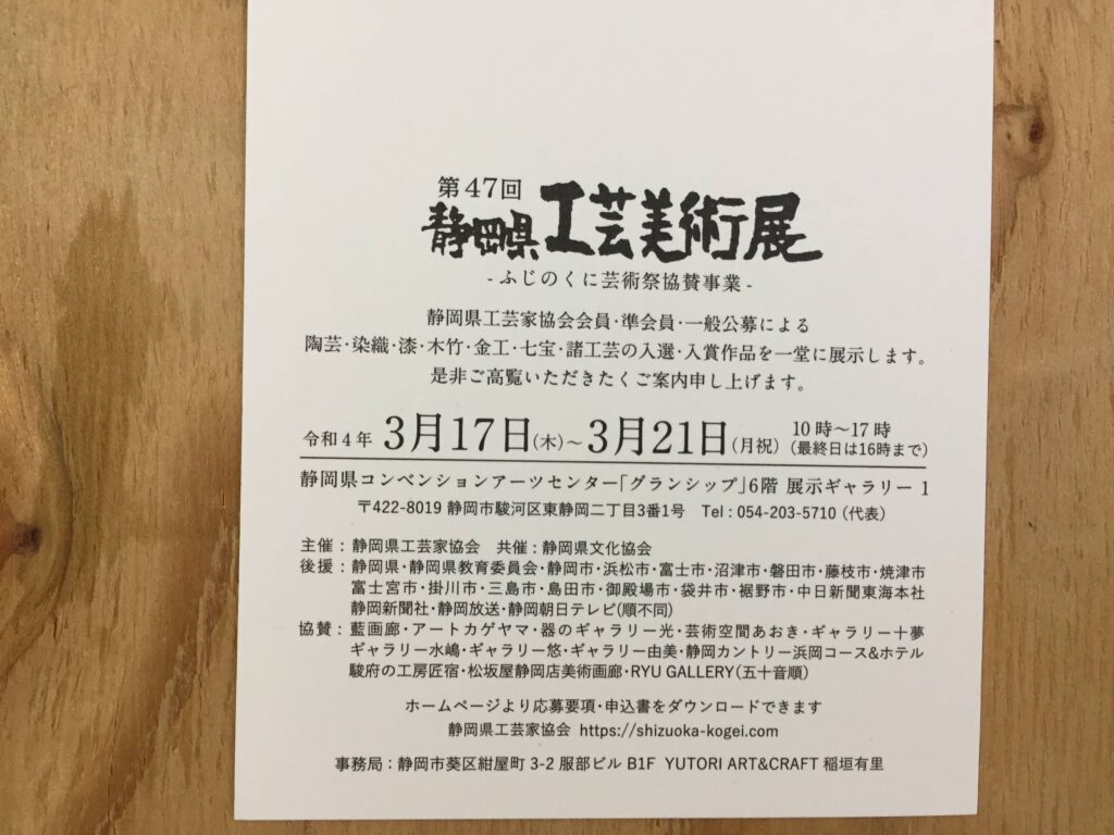 小割先生が会長を務める静岡県工芸家協会主催の静岡県工芸美術展が行われます。