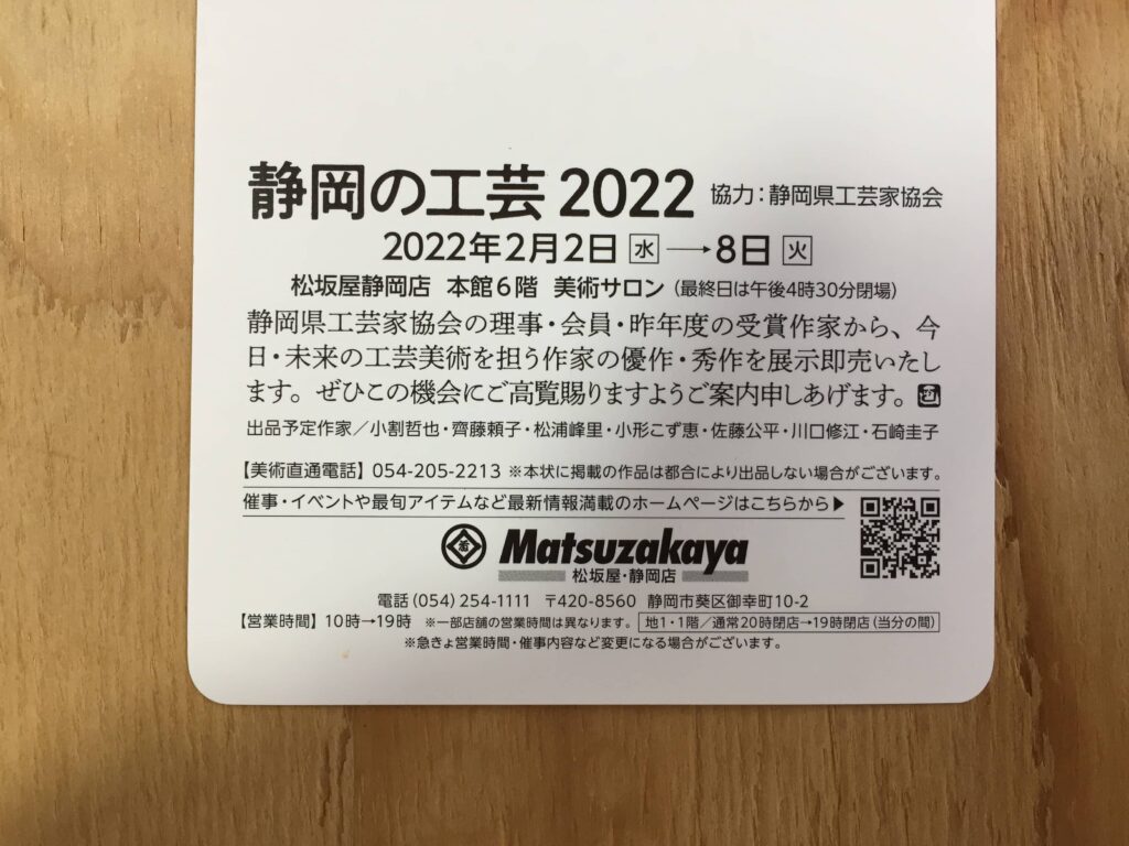 小割先生が会長をつとめる静岡県工芸家協会の協力で行う静岡の工芸2022が松阪屋静岡店で開催されます。
